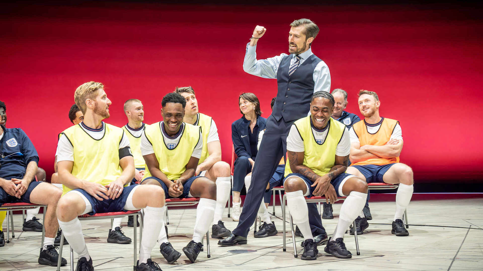 Dear England is set against the backdrop of Gareth Southgate’s reign as England manager, and the legacy of hurt he inherits from years of unsuccessful tournaments, including his own personal trauma from missing a now historical penalty in 1996. However, instead of accepting the weight of England’s story that has been passed down from generation to generation, he begins to challenge it. He asks questions that have never dared to be asked before. Why does the nation have the expectation that we should always win? Why get so angry when we don’t? The fact is we have only ever won once and that was in 1966! Why do we find ourselves in countless penalty shoot outs? Why can’t we win them? Why can’t we win full stop? Why is the culture aimed solely on physical strength with no focus on mental strength or agility? And why is being England Manager one of the most scrutinised jobs in sport and known as the impossible job? As Southgate advocates for change against an army of ridicule, he starts to discover that in order to create true change, he must first face his own demons and stop running from fear. With renowned psychologist Pippa Grange by his side, they discover that perhaps the toughest game they need to win is breaking down the stigma of mental health, particularly in men’s sports. As they strive to create change and challenge the entire institutionalised rhetoric of sport, the promise of a new future begins to shine through via the formation of an innovative collective culture within the England camp. As we witness these young players being a target for hate, racism, classism, and judgement, we are bluntly told that perhaps it isn’t a case of the England team learning how to win, but maybe that England fans need to learn how to lose. These universal themes of mental health, hope, redemption, facing our fears, and writing our own story strike a poignant chord with everyone in the audience, and prompt us to start being honest with ourselves and taking accountability for the way in which we choose to react and respond when faced with difficulty.